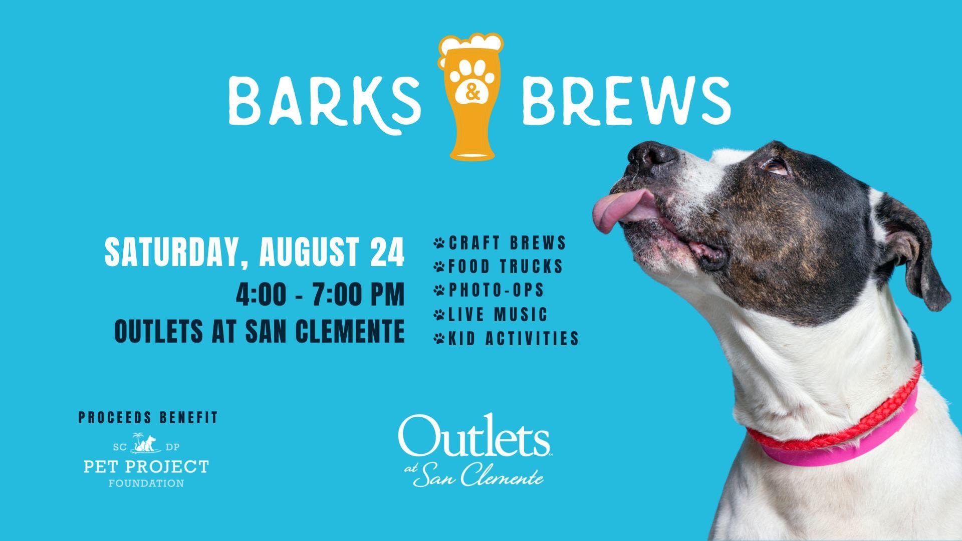 Come for an unforgettable day of fun and excitement at Outlets at San Clemente's Annual Barks & Brews event! Bring your furry friends and the whole family on Saturday, August 24, 2024, from 4 PM to 7 PM for an afternoon filled with delightful activities and entertainment.