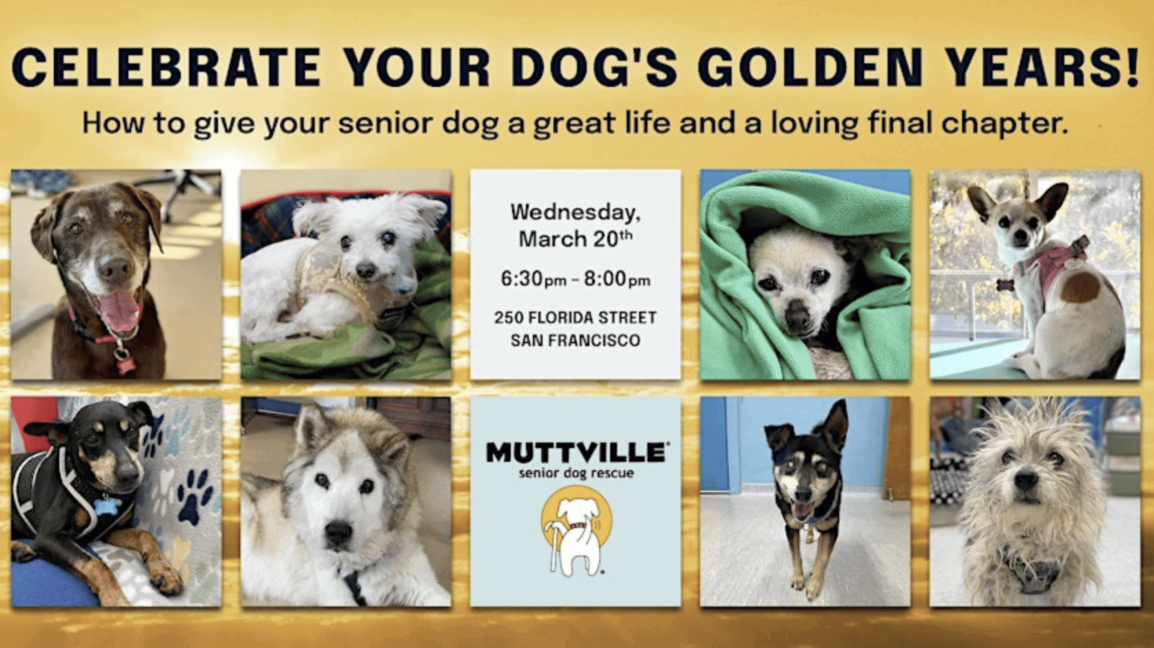 Moderated by Muttville's Chief Veterinary Office Angela Ramiro, they'll discuss enriching activities to engage your senior, products to ease the challenges of aging, how to find appropriate medical care, how to assess quality of life, evolving choices in hospice, palliative medicine, and end-of-life care, and the crucial things you MUST do to prepare for your pet’s final chapter.